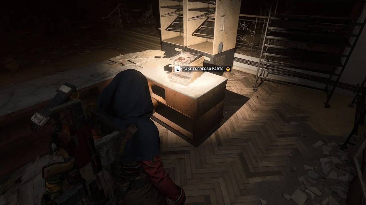 Interact with the machine to take some espresso parts. As a reminder, these don’t automatically go into your inventory. The parts will drop on the counter, so make sure to pick them up. It’s also a good idea to place them in your safe pocket in case you don’t make it out alive.