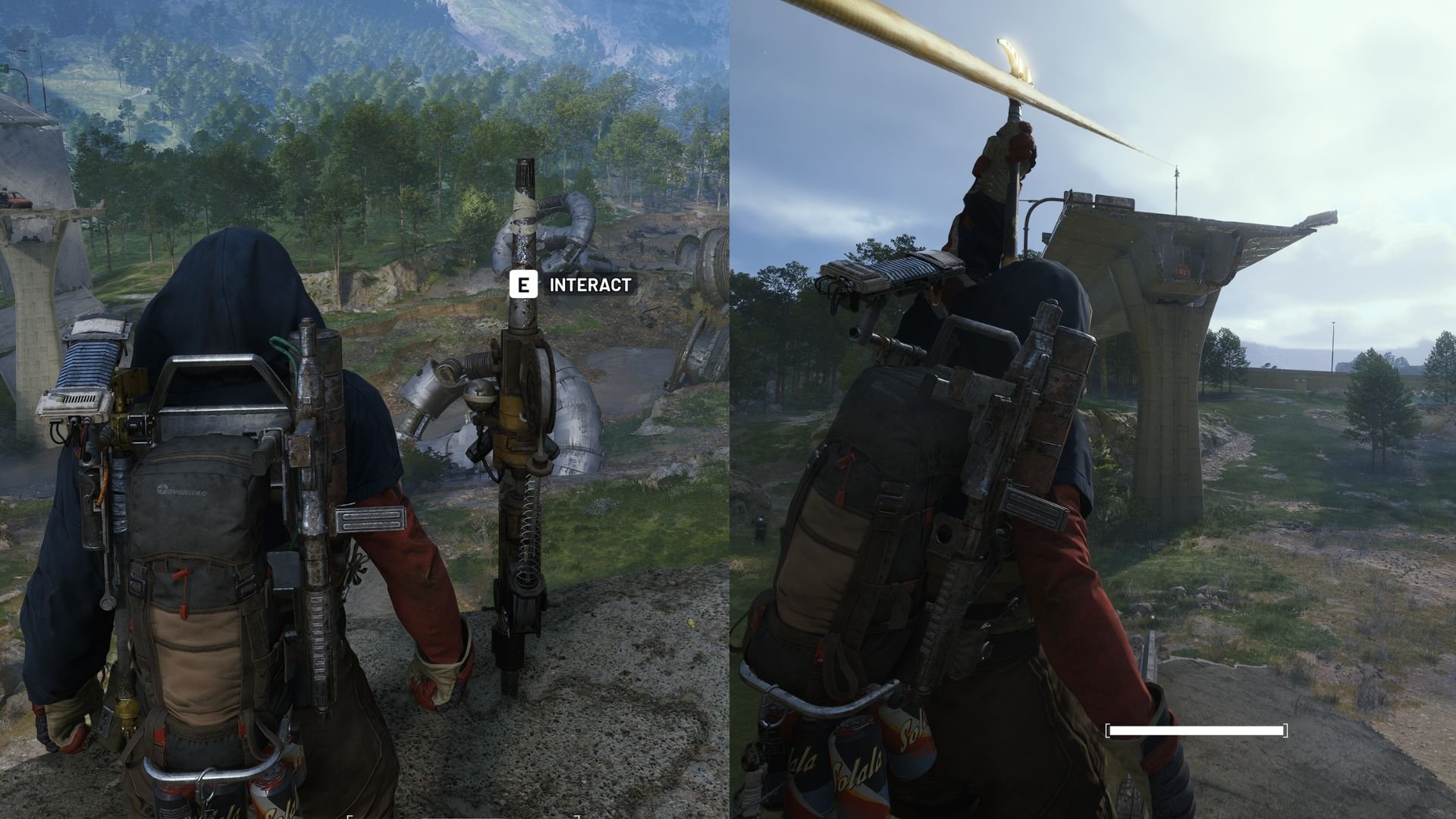 If you are struggling with the timing and finding yourself kissing the ground in a near-fatal manner, you can also bring a zipline of your own and point it directly at the opening. You can also stand at the edge of the collapsed highway while looking north and slowly walking backward. That way, you can maneuver mid-air and grab the ledge of the opening, allowing you to enter the shelter.