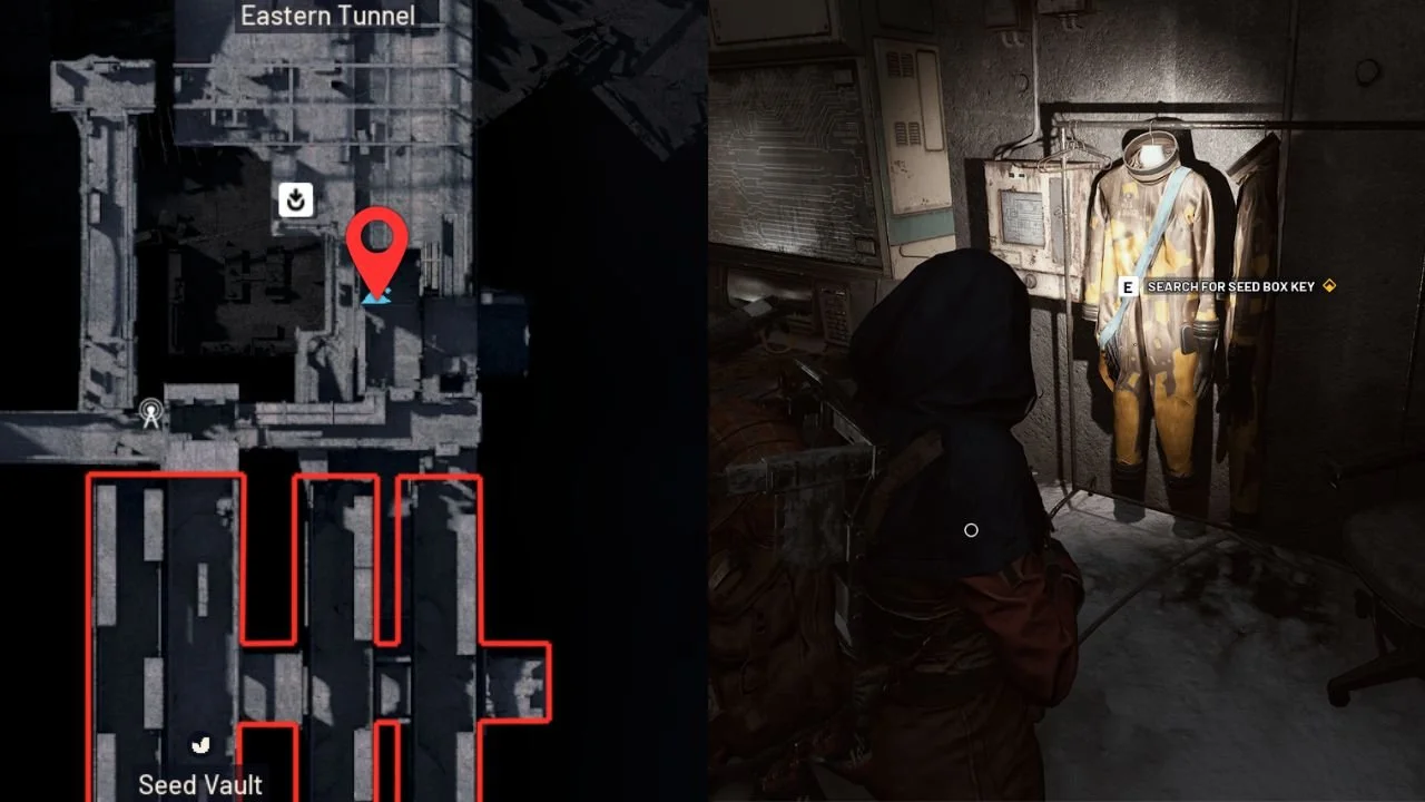 Beside the large computer will be a rack with hanging suits. Search for the seed box key here, and the Seed Vault Box Key will drop. Don’t forget to pick it up, because you’ll need it for the next part of the quest.