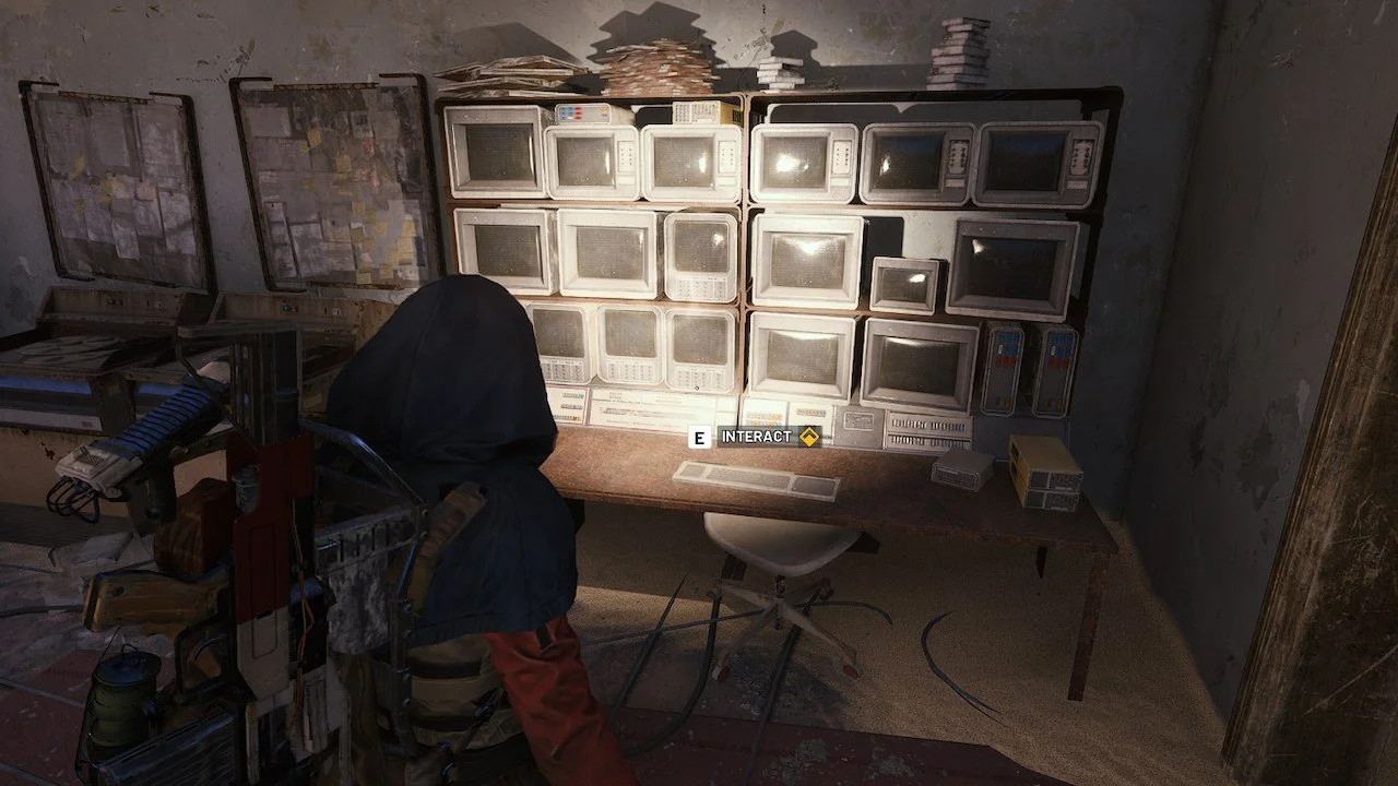 No matter the method, find the highest floor that isn’t the roof, and you’ll see a room with a desk full of monitors. Interact with the computer, and you’ve done everything needed for this quest!