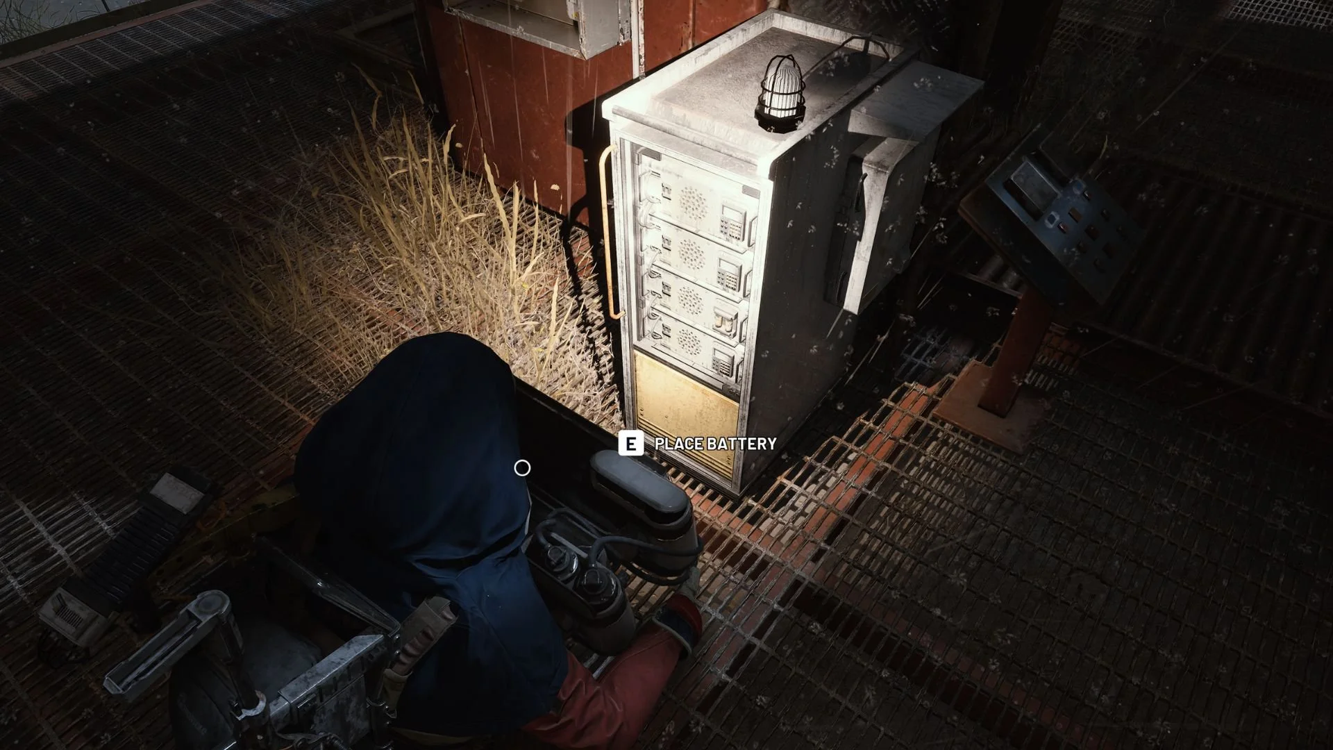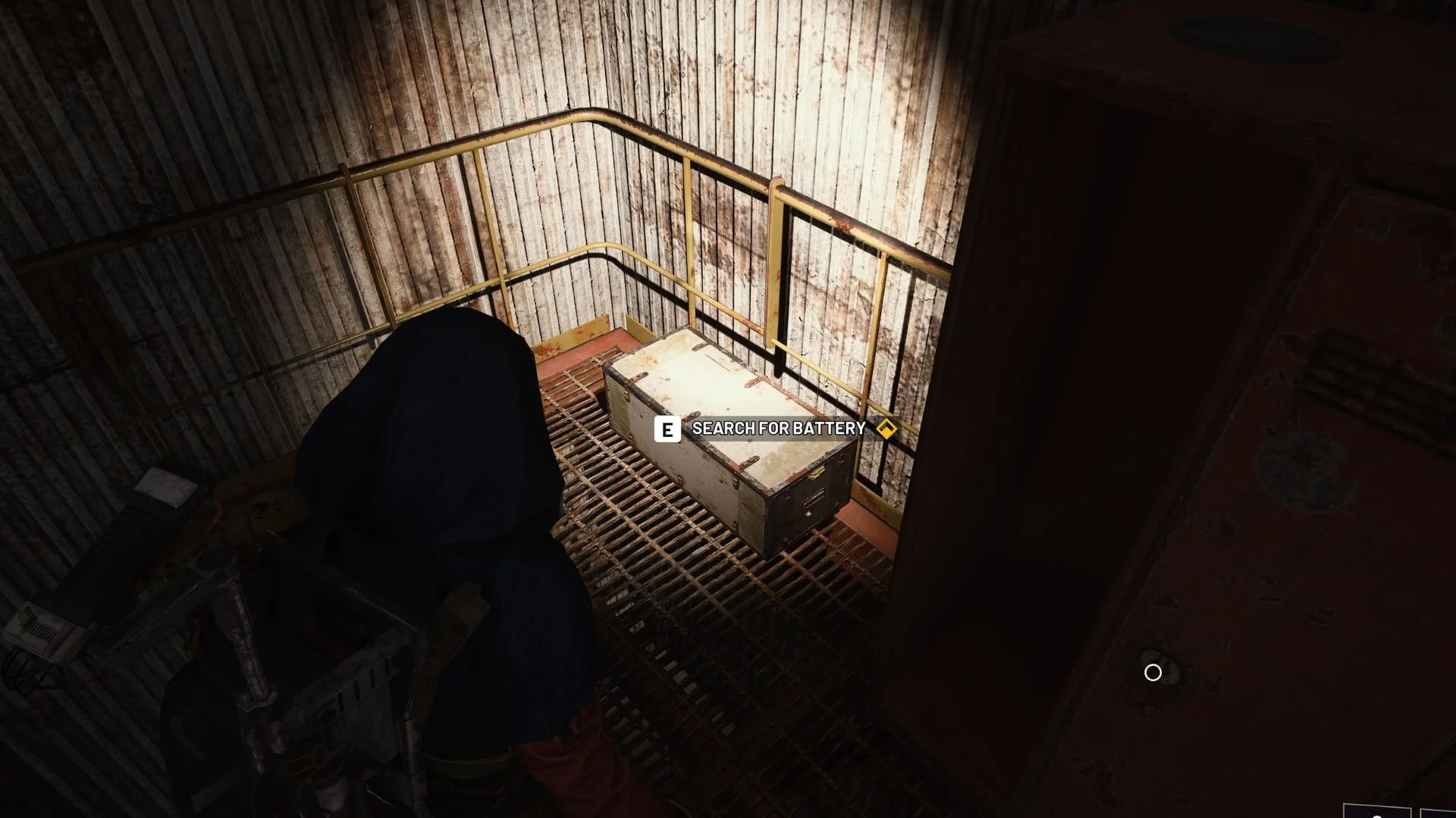 Go up the stairs to reach the “high place” that the objective is referring to. In a corner, right beside a red locker, you’ll find a container. Interact with it to unveil and carry the battery.