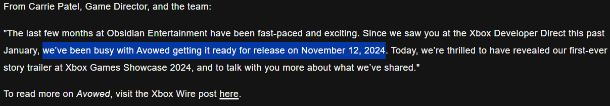 On their official blog post, Obsidian highlights the story trailer shown and toward the end of it, they let out the release date for the title to be November 12th, 2024.