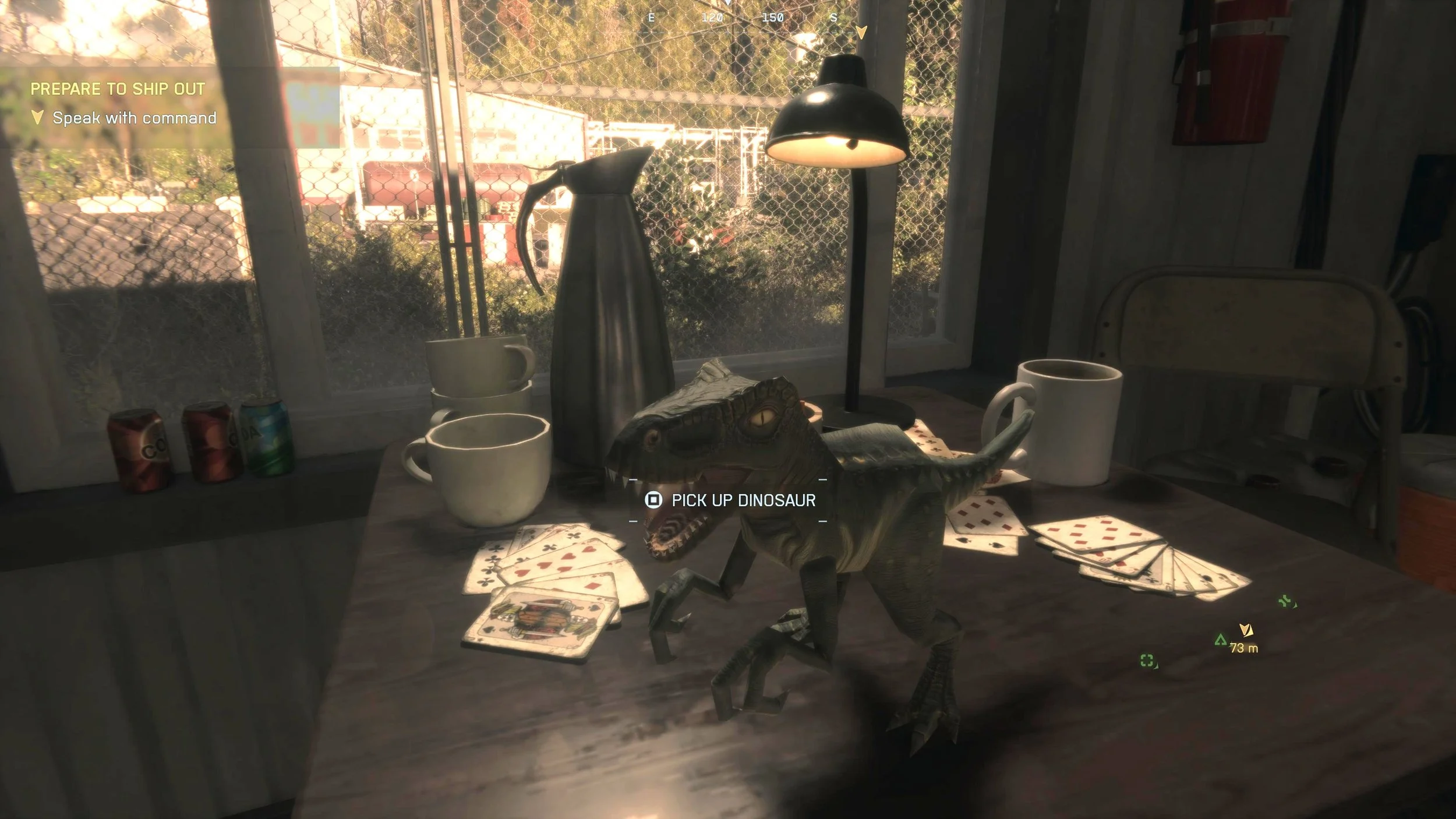 While the dinosaur figurine is located on the square table behind you, it’s possible you saw it and assumed there was no way to interact with it. This is because the interaction prompt is a bit finicky with this collectible. If you’re struggling to get an interaction prompt to show up, squat down and approach the dinosaur from the left a bit until it pops up. Press the corresponding button to snag it.