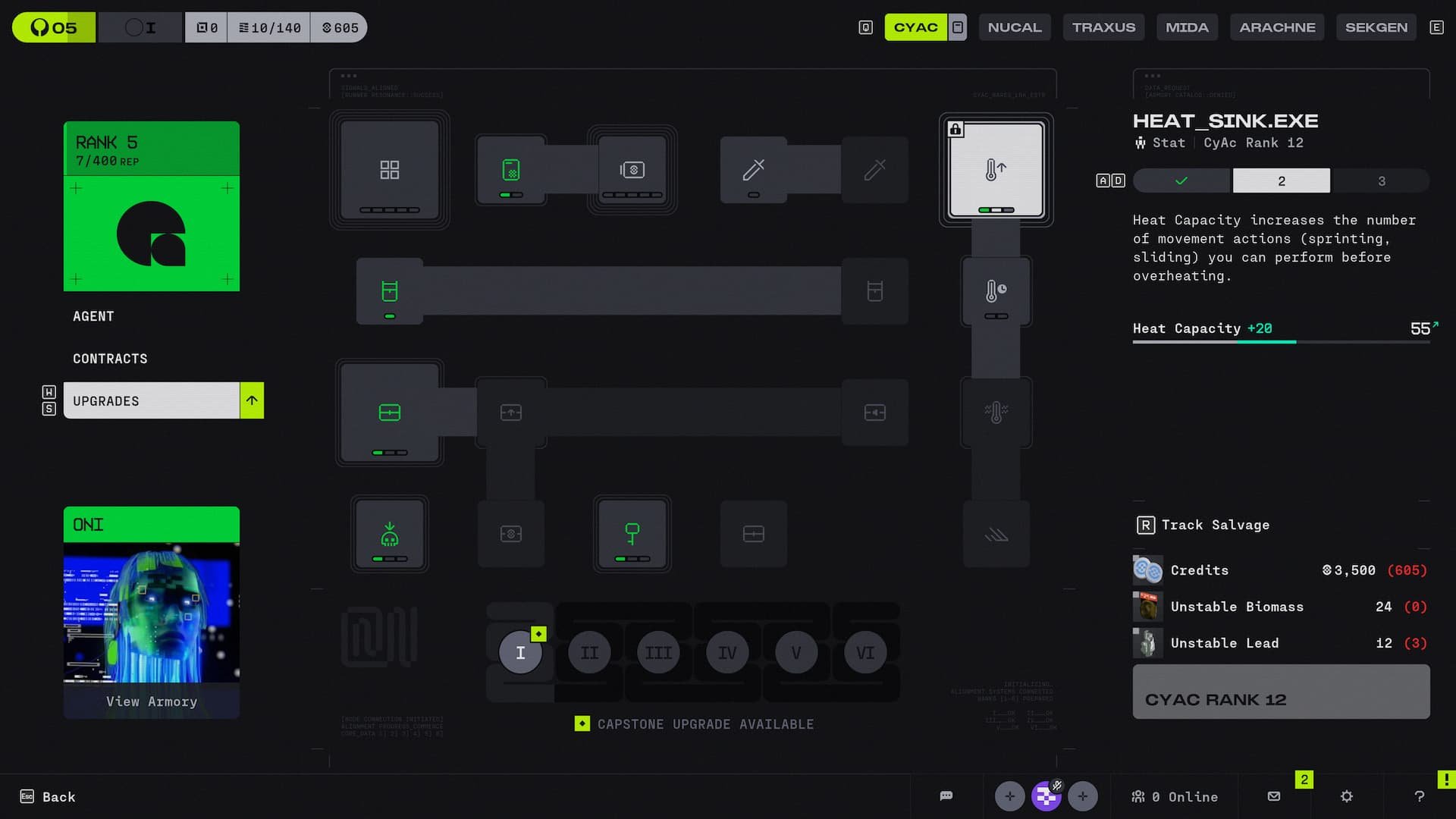 This means more sprinting and more abilities before your Shell overheats, which is vital in a game that can be particularly competitive. Complement this with Firm_Stance.exe to increase your Fall Resistance and Informant to increase your data card credit rewards, which will, in turn, help you acquire more upgrades.