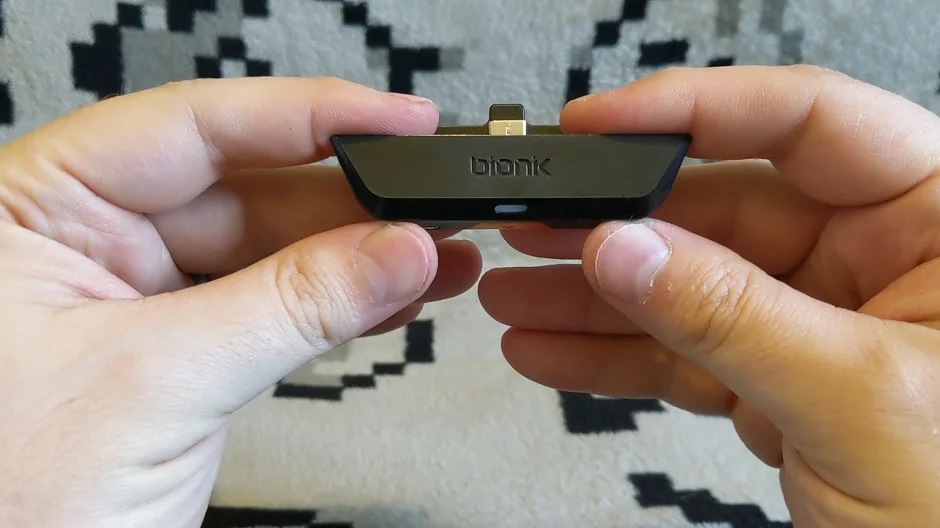 Again, the BT Audio Sync is sleeker than I was expecting, with the whole device being roughly the size of my index finger. The front features a glossy Bionik logo and some sleek bevels that lead to the sides and bottom of the unit. Smack dab in the center of this beveled area is a status indicator LED. The bottom has a nice, flat and curved design that houses a single orange sync button and a USB-C power port.