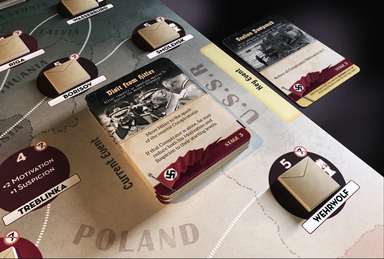 Several statuses must be managed in order to achieve victory. Players have two conspirator tracks that fluctuate. One is the individual’s motivation, which controls the effectiveness of their maneuverings and the ability to follow through with a plot. The other is the level of suspicion that the individual’s behavior arouses. Highly-suspect conspirators will have reduced chances of successfully removing Hitler from power and increased chances of arrest from the Gestapo.