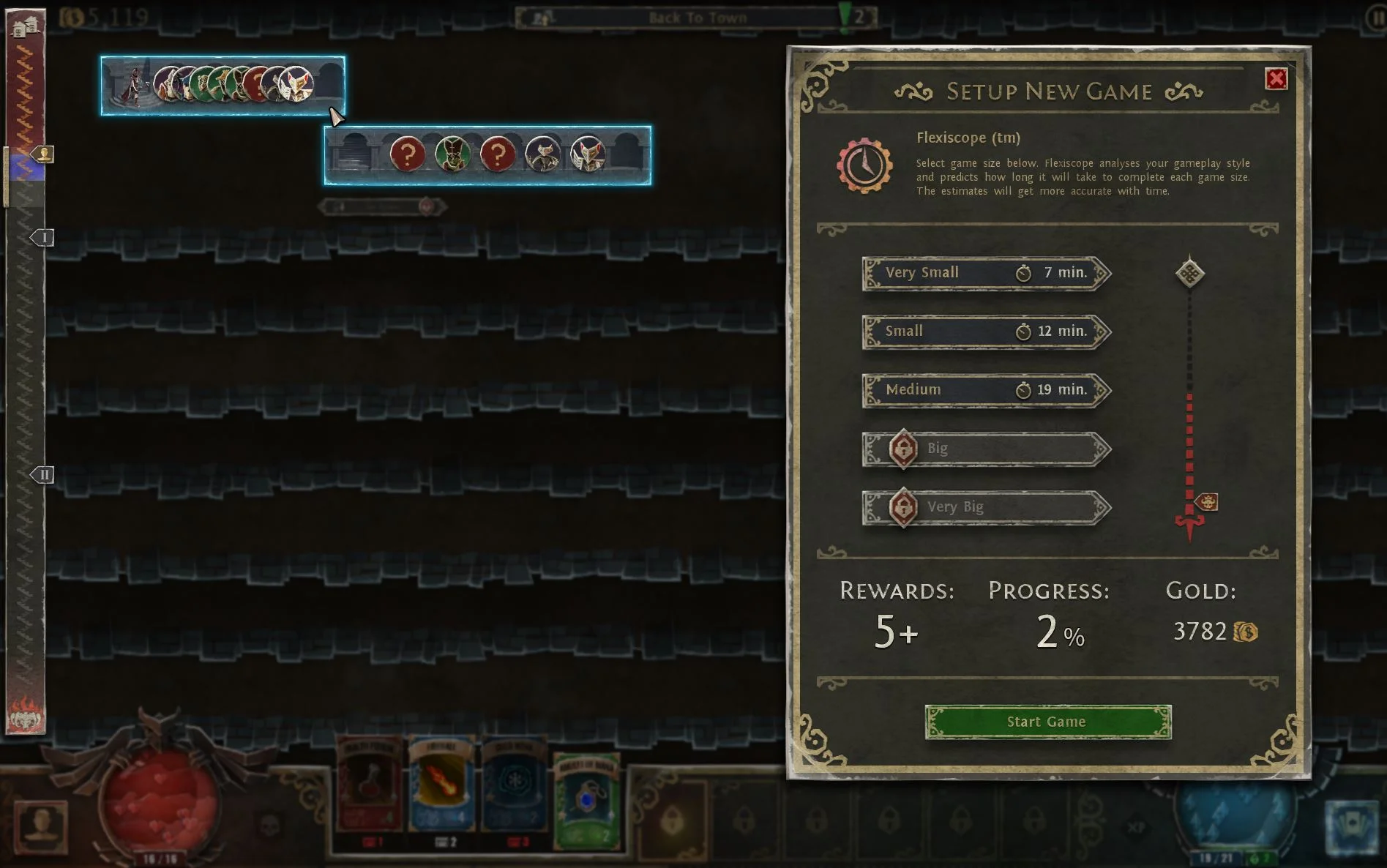 I love collecting things in game especially with a sweet payoff. In Book of Demons you collect cards that unlock skills like fireballs for mages or shield bash for warrior. It’s so simple but so addicting as you have a limited amount of skill spots, and you have to manage them carefully. Also, being able to set your dungeon size as shown in the screen above is also simple but oh so unique.