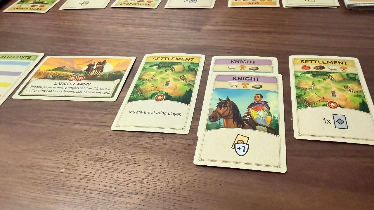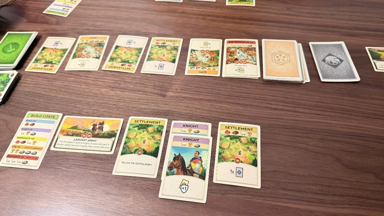 Instead of the traditional modular board, the game uses decks of cards, including a resource deck and a building deck. The overall goal still feels familiar: earn victory points as quickly as possible by building up your position more efficiently than everyone else. On your turn, you gather resources based on how many Settlements, Cities, and Metropolises you have in play, then use those resources to build roads, expand your settlements, recruit knights, and trade when needed. The core identity of CATAN is still here, just in a much more simplified form.