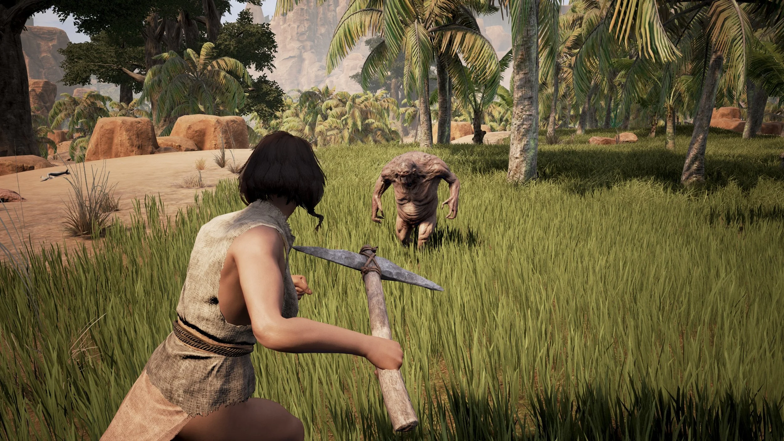 After I harvested some plants, sticks, bugs (yum!), and stones, I crafted some basic stools like a torch, pickaxe, and a vest but stayed pantless. Yeah, that's hot. After bashing some skulls, I got into a much larger battle and then died of thirst. I usually am not enthralled with these types of games but between the gorgeous graphics, unusually high quality (though not finished) production values and solid environment interaction, consider me impressed. If you like Conan, survival type games or even better, both, this title is worth your time and gaming dollar.