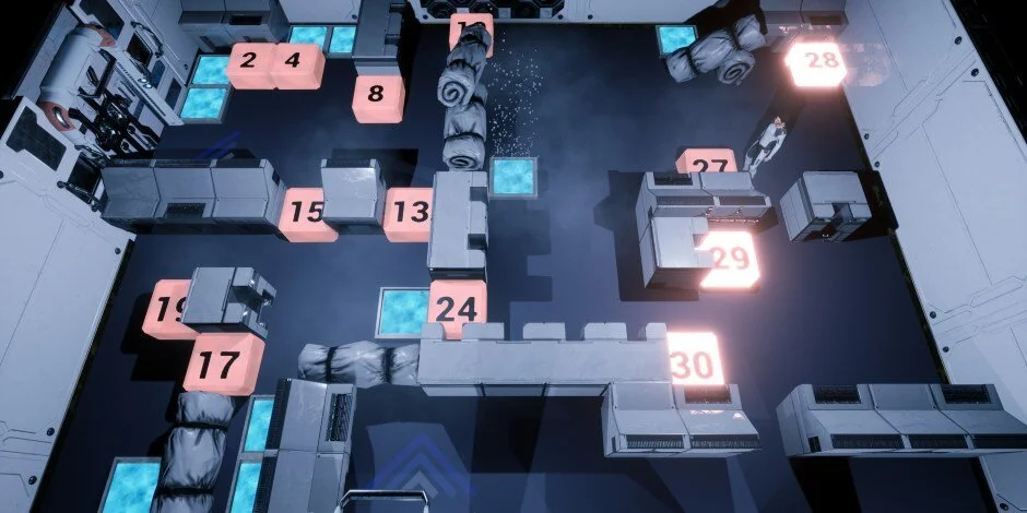 There are multiple block puzzle mechanics that they end up using and each one changes how you need to approach each puzzle. The full list of different puzzle block types includes basic tan, time-limited where the counter starts once you move the block once, move-limited where the block is stuck after X amount of moves, chain link where two blocks move opposite each other, color blocks where you have to put them on the matching lit color panel, glitch-limited where much like the move-limited blocks you only get X amount of moves before that block glitches back into its original starting location, and the sticky blocks where they stick to other blocks as they pass by them. Separately, each one of these makes you approach a puzzle in a different way, but once they start putting all of these mechanics together into one puzzle things get tricky.