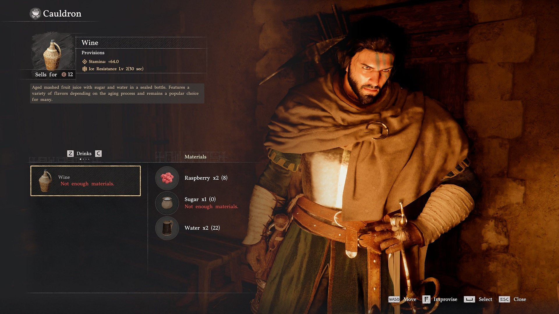 The recipe requires 2 x water (found in the wild or bought at any general vendor) and 15 x of most common flowers plus an alchemy cauldron, found easiest early on in the center of Hernand town. We use marigolds and peonies as they are the most plentiful and easy to found early on. Make sure to select the substitute ingredients on the cauldron menu!