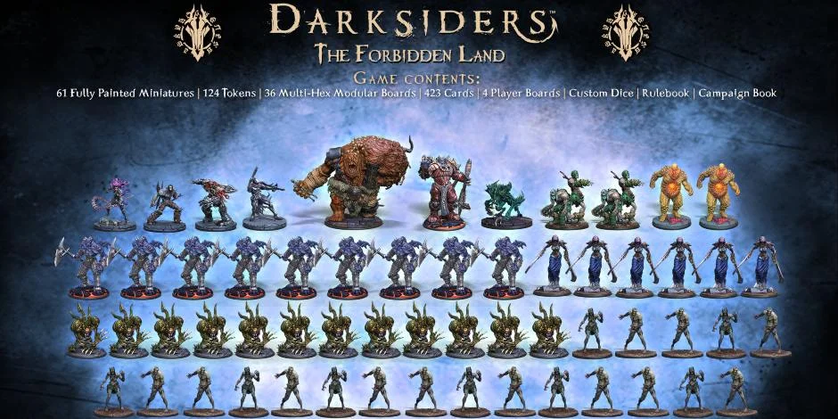 This board game is going to feature quite a few interesting aspects. For starters, it is a co-operative dungeon crawler board game for 1-5 players that will let players take on the role of their favorite Horseman and battle alongside your fellow Riders through an entirely new storyline set in the Darksiders universe. The fifth, and optional, player would be the Game Master. Without the game master, there are rules determining how the enemies of the Four Horsemen will behave, but with a game master controlling the monsters an extra level of challenge. It will also feature 61 incredibly detailed and pre-painted minis (seen above) alongside customization decks of cards for each Rider that will allow every playthrough bring about its own experience.