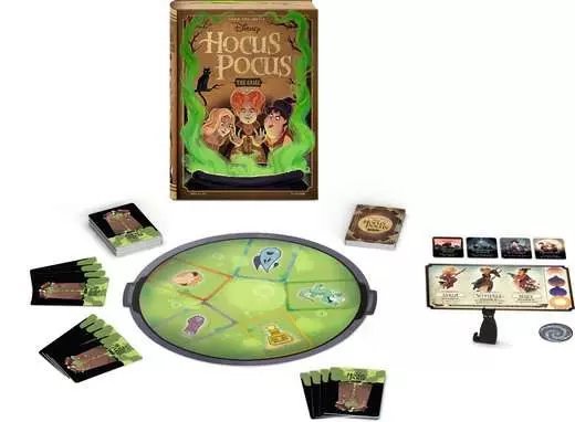 Disney’s Hocus Pocus is a cooperative board game by Ravensburger, for up to six players. The box includes two boards—one for placing cards and another for the witches—along with a Binx token, several trick tokens, and a deck of cards.