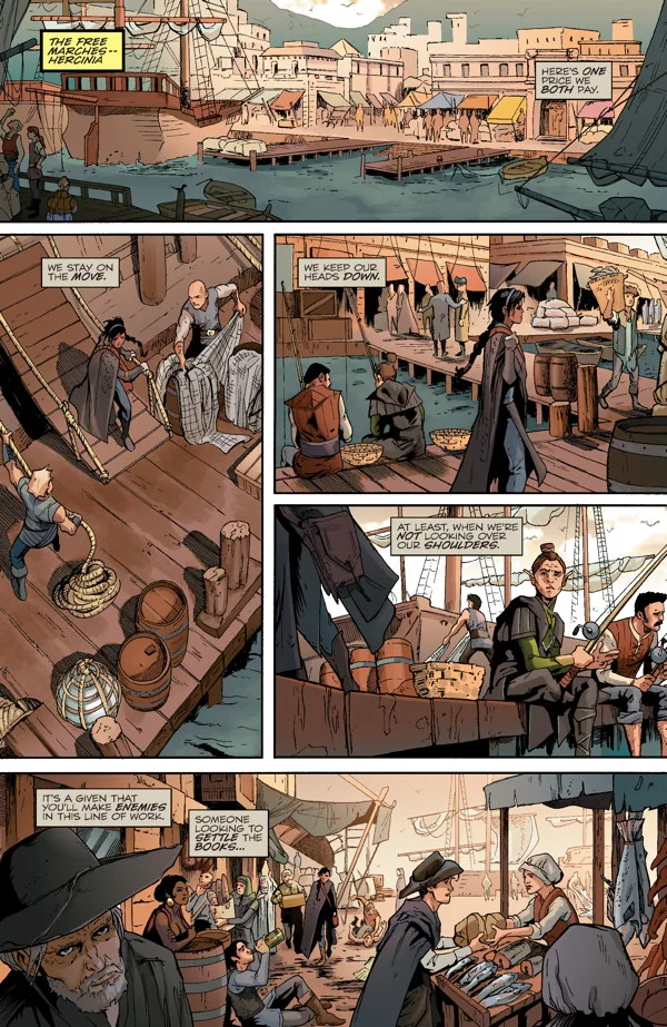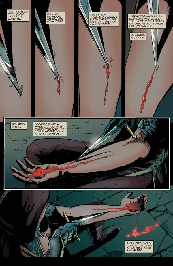 GR: That’s fantastic, and I don't want to understate it, because all of that is stuff we worked on, when I was coming up with Tessa and Marius, and actually writing descriptions, these were going back to Bioware and being approved, and they were being approved by, I believe it's Matt, who sits next to Laidlaw, who is the art director. All those visuals go past him, so trying to make sure that the pallette was the right color palette, the costuming, what they’re wearing. I’ve said in other interviews that because I’ve played the games, I wanted it to be recognizable. There is nothing worse than when you’re invested in the IP, in the property, and you pick up something that is supposed to be based in it, and it doesn’t look like it, or the story doesn’t make sense in the context of the world you know. Kind of the tightrope we were walking for this is wanting to make sure we had something that a new reader could get. Someone who had never heard anything about Dragon Age could read it, get it, and enjoy it. For the audience who knew Thedas, that was to some extent experienced in the lore, but they would look at it and say “Oh Winter's Grasp, I know that spell”, or “Wait a minute, that's a rogue and rogues don’t use long-swords in the game” you know, so we just wanted to be consistent.