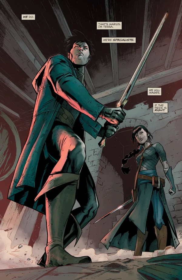 MM: Well, if we are paying compliments, throughout the first issue, there were multiple times that, well, for context I have actually been replaying Dragon Age Inquisition for the second time through, and the book came right in the middle of that, so I’ve been reading at a perfect time with all of it fresh in my memory. Going through here, Marius and Tessa fit so well into the Dragon Age mold, that at multiple times while reading, the scene played out in my head as if I were walking through the world with those two bantering behind me, just as if it were Cassandra or Dorian. They just fit so well, and at a certain point I would love to play these characters in a future Dragon Age entry.