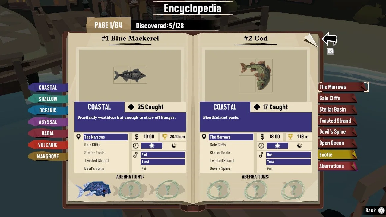 This is one part of the game that I think was done very well! There are plenty of fish to catch to fill out your Encyclopedia. Some fish are more rare that can only be caught during certain parts of the day, and all fish have multiple aberrations or mutations that you can sometimes find. On top of that, the game doesn’t require you to do any pursuits so you can go back into the game to finish those. There are also small islands on the maps that have bits of scenery to explore that tell little stories and you can generally find townfolk there as well to give you extra pursuits. The fishing on it’s own, I feel has enough to reel me back in just to pass some time.