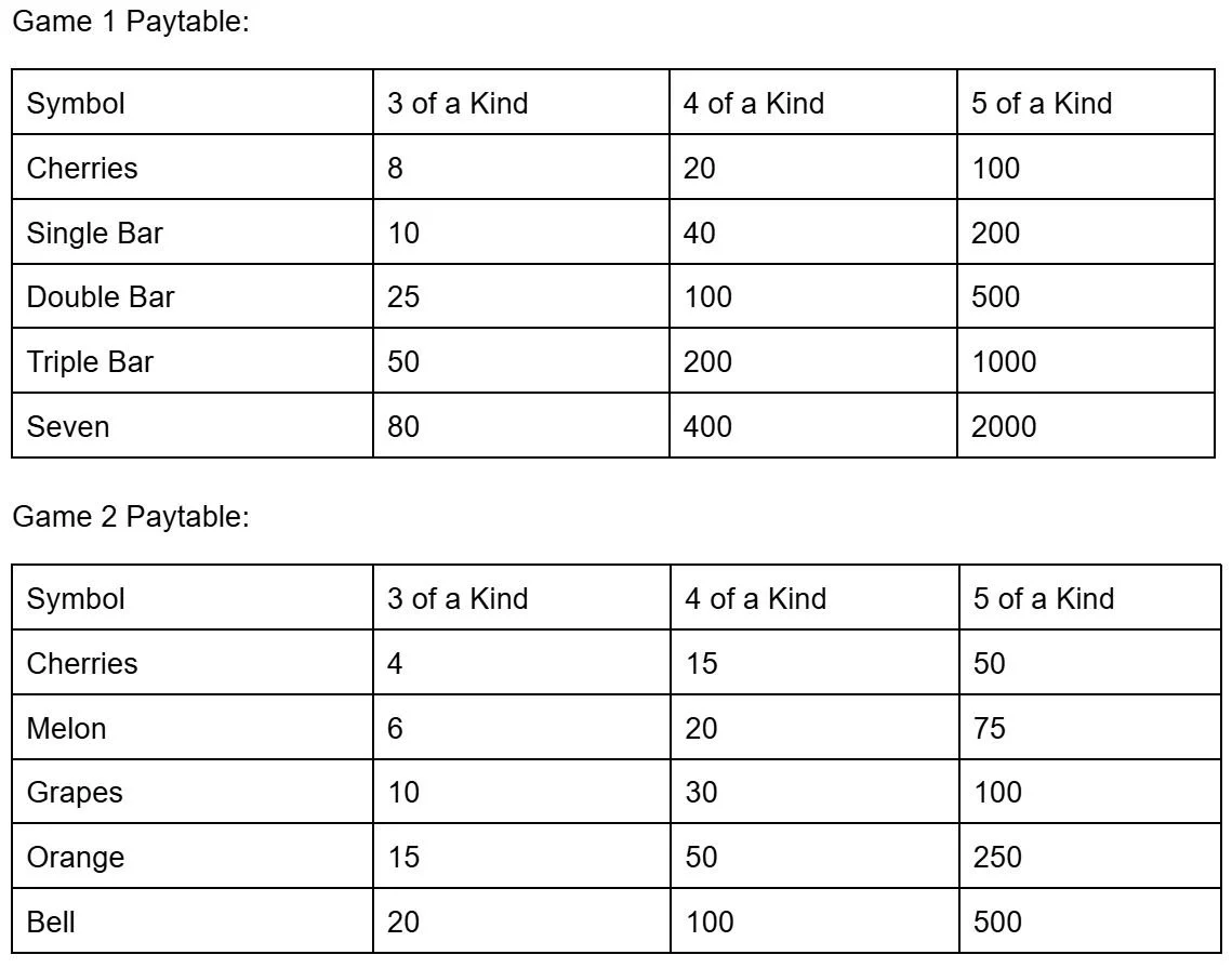 At first glance, these games appear similar, but Game 1 offers significantly higher returns across the board. Game 2 pads its bottom line by reducing payouts on hitting winning symbol combinations compared to Game 1.