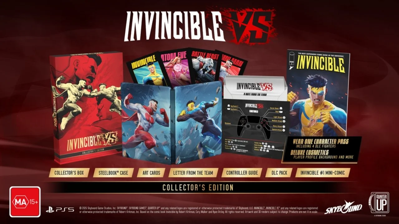The Collector’s Edition includes a physical disc, Steelbook Case, 4 Character Cards, Printed Controller Layout Card, Invincible #1 Reprint, Dev-letter, Premium Packaging, and Keepsake Cards.