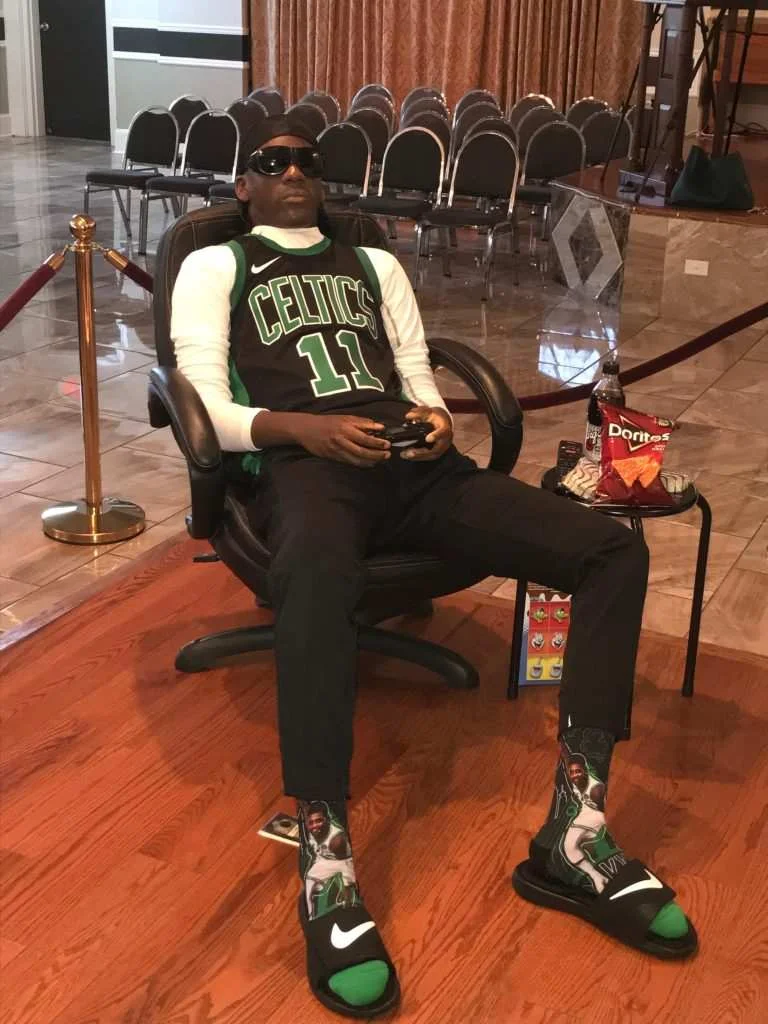 Instead of laying his body in a casket, the family posed Matthews seated in a chair in front of a TV playing NBA2K. Matthews was dressed in a Kyrie Irving jersey complete with the matching socks and sunglasses. To his side were his favorite snack, a bag of Doritos and a bottle of root beer.
