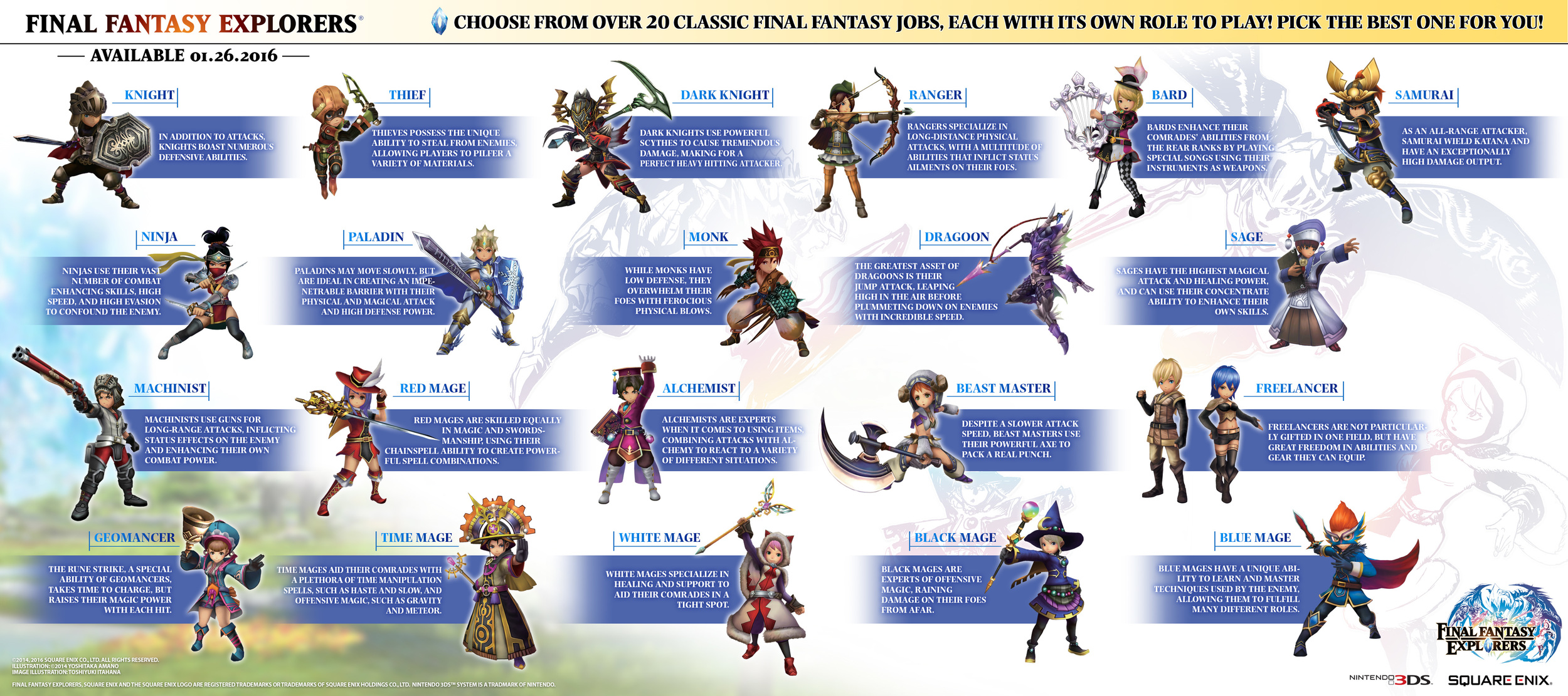Final Fantasy Explorers is inching closer to release, and now we have a bit more information on the job classes shipping with the game. All the expected ones are here, and they adhere pretty closely with what you'd expect. The exception here is the Blue Mage, whose abilities are predicated upon what skills he absorbs from enemies, giving the player a blank canvas in a way. The Blue Mage and the Samurai were DLC in Japan, but are included with the North American game out of the box.
