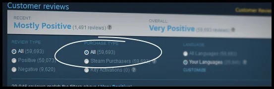 One frequent piece of feedback we’ve heard regarding the recent changes is that it has become more difficult to find and read the helpful, articulate reviews written by customers that obtained the game outside of Steam. We want to make sure that helpful reviews can be surfaced regardless of purchase source, so we're making a change to the defaults. Starting today, the review section on each product page will show reviews written by all users, regardless of purchase type. By default you'll now see reviews written by all players of the game, including Steam customers, Kickstarter backers, bundle customers, streamers, and other users that acquired the game outside of Steam.