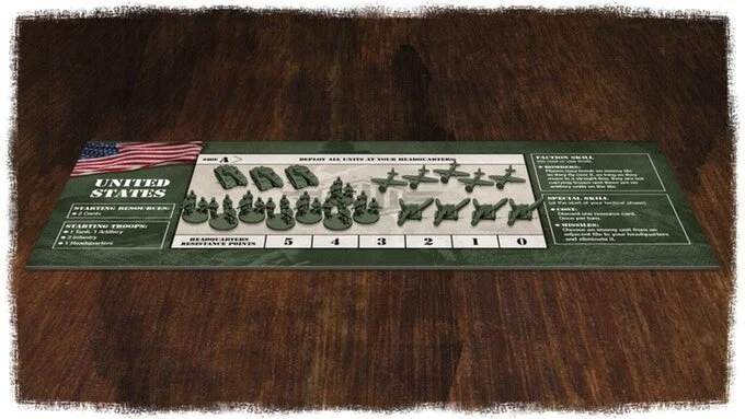 Every game begins with players choosing which army to command. The core game includes the United Kingdom, Germany, the Soviet Union, and the United States. The expansion adds France and Japan to the pool of available nations.