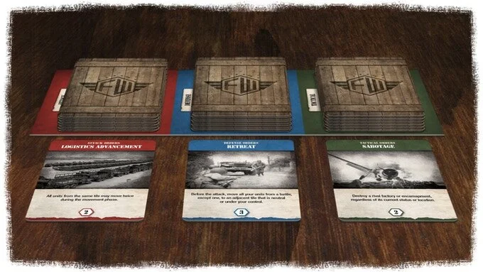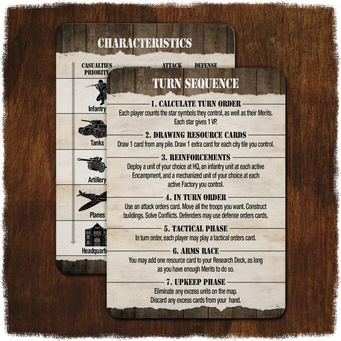 When everyone has finished their actions for the round, tactical orders are played, the arms race is researched, and all excess troops or cards are removed.