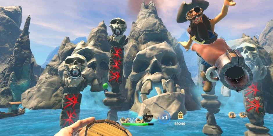 The rhythm of catching things and hitting targets just feels good. An important gameplay mechanic here is "Uptrading", which means hitting a target that will gift you a better weapon in return, so the player is constantly on the lookout for trade-up opportunities. That ”dance” of catching and throwing can be quite addicting, I think we especially nailed it in some of the dinghy boat waves in the pirate world or the big sacrificial head waves in the underworld levels.