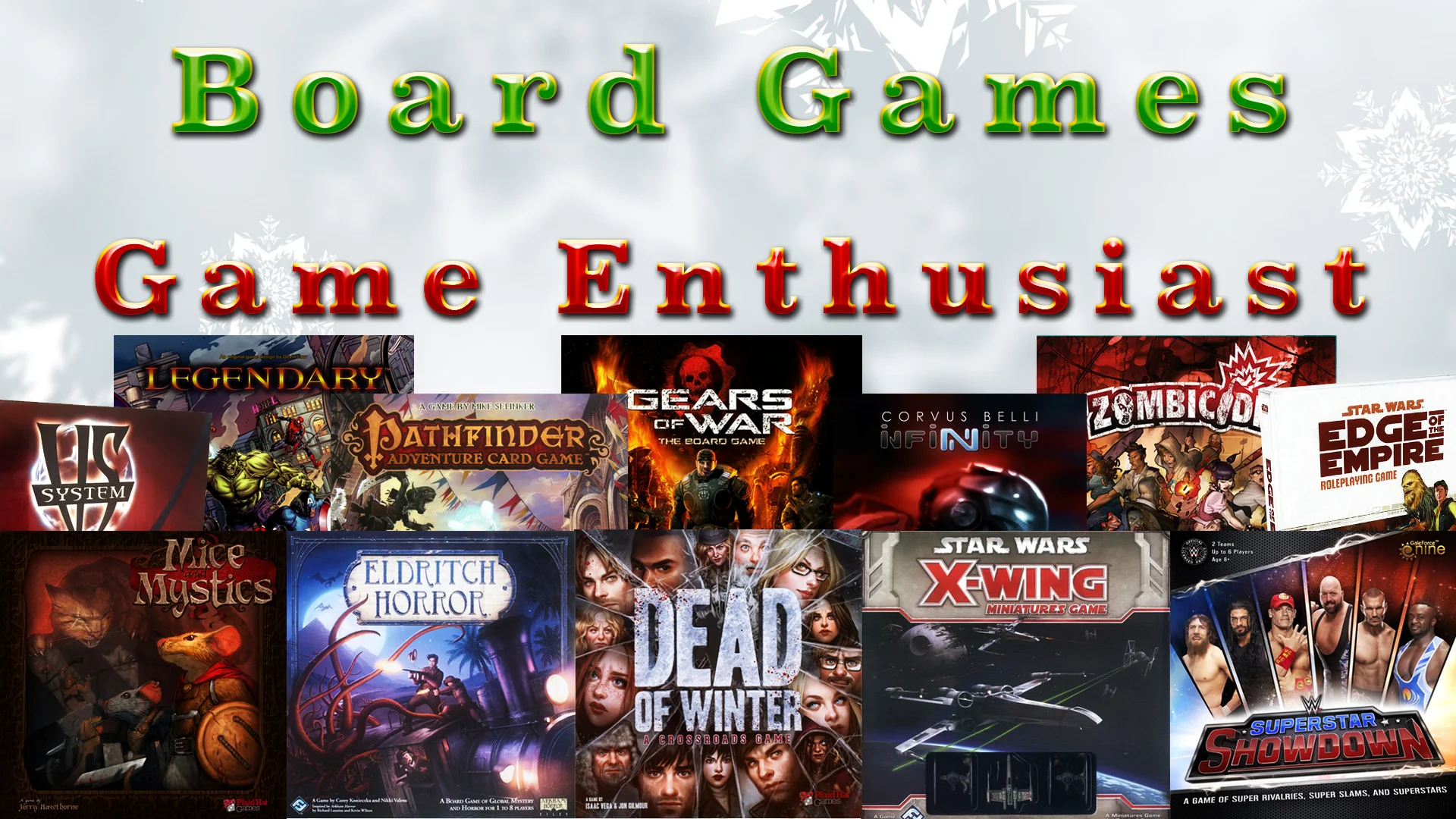 Game Enthusiast Games: Mice and Mystics, Eldritch Horror, Dead of Winter, X-Wing, Superstar Showdown, Vs System 2PCG, Legendary, Pathfinder Adventure Card Game, Gears of War, Infinity, Zombicide, Star Wars Edge of the Empire