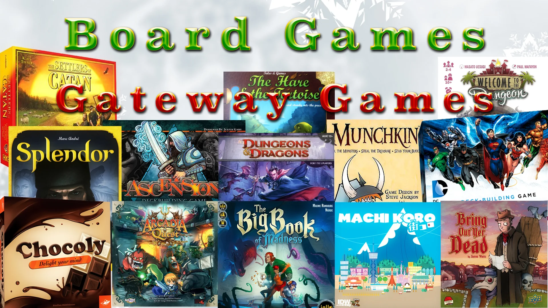 Gateway Games: Ascension, DC Deckbuilding Game, Arcadia Quest, Settlers of Catan, Chocoly, Machi Koro, Welcome To The Dungeon, Dungeon and Dragons: Castle Ravenloft, Big Book of Madness, Splendor, Iello Fairy Tale Series, Bring out yer Dead