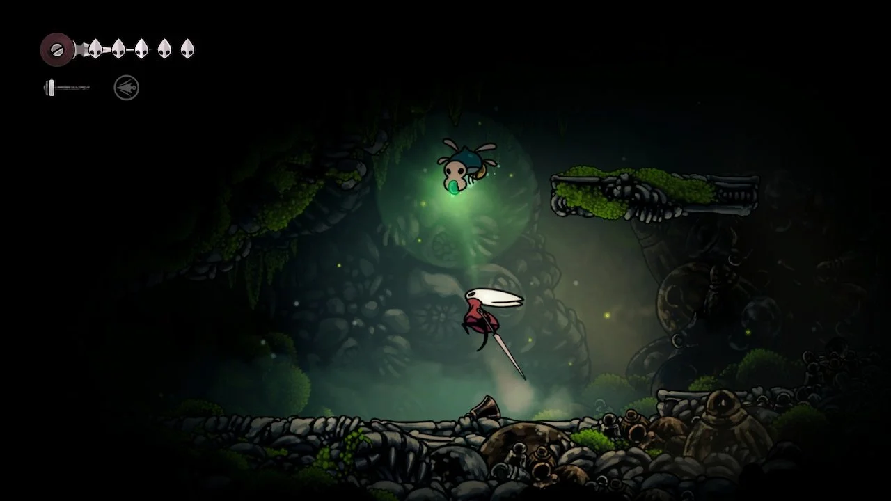 The second one in Moss Grotto hangs high up in the room around a flying enemy. The trick here is to use the flying enemy to reach the Mossberry. Jump into the air, then aim downward and strike the flying bug. Hornet will hop a little higher, high enough for you to slash at the Mossberry and make it fall.