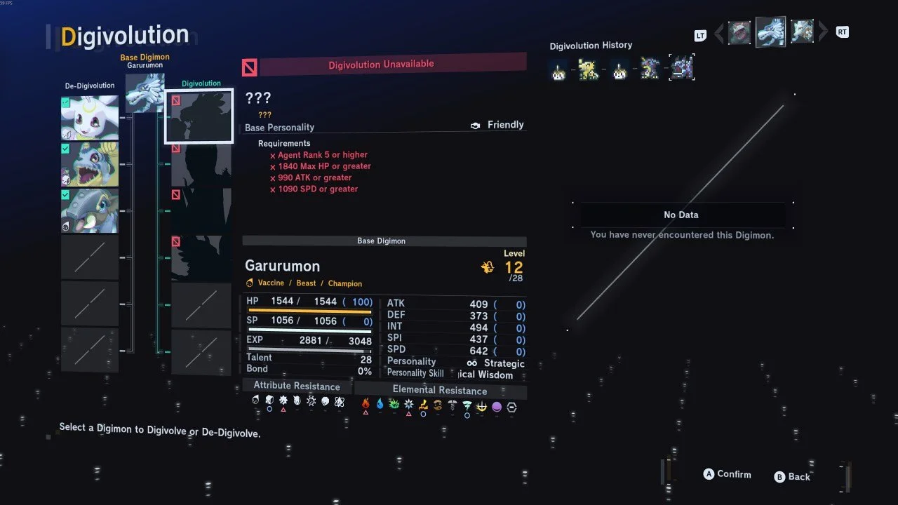 If you’re ready to evolve Garurumon into WereGarurumon, you’ll first need to raise your Agent Rank to 5 by progressing further in the main story and taking on plenty of Side Quests for extra Anomaly Points. Once you’ve reached that milestone, it becomes all about training. Chances are, if you’ve been using Garurumon regularly in battle, you’re already well on your way, but some extra stat boosting may still be required. To meet the requirements, Garurumon will need at least 1840 Max HP, 990 ATK, and 1090 SPD. It’s a bit of a grind, but once those conditions are fulfilled, Garurumon will Digivolve into WereGarurumon, the first silhouette on its evolution line.