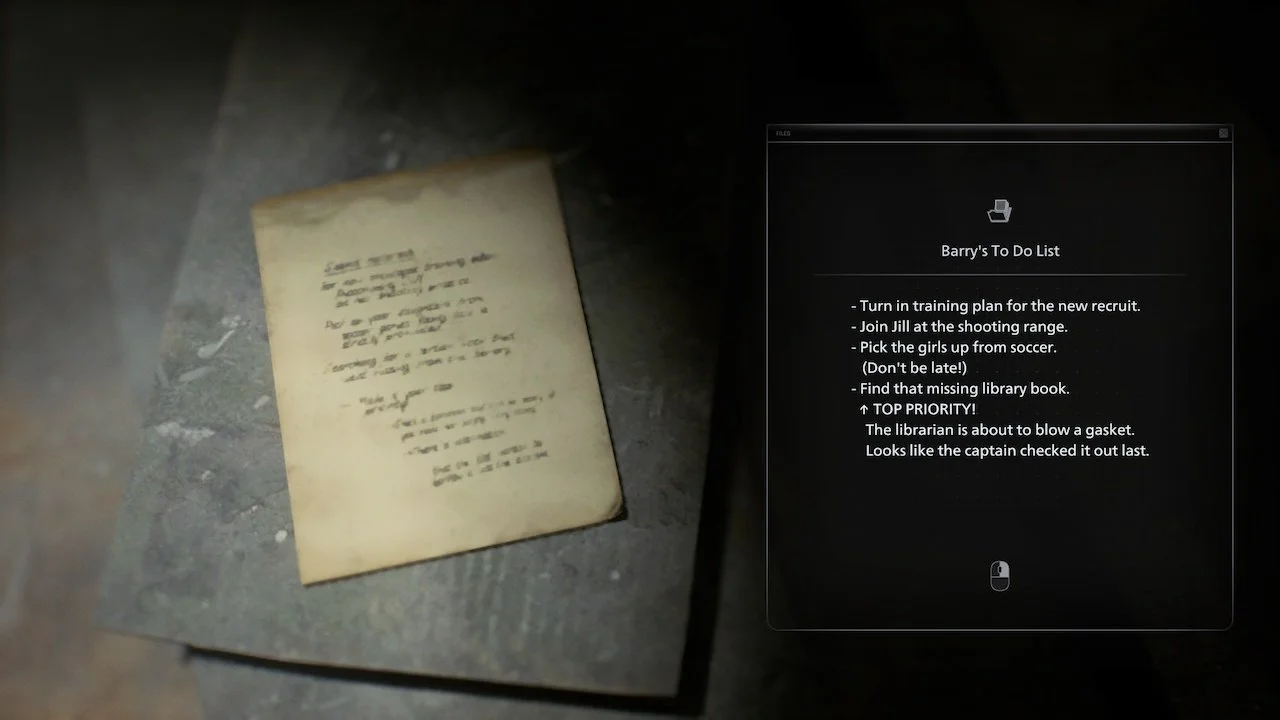 After finding the briefcase in the S.T.A.R.S. Office on the R.P.D.’s second floor, leave the locker room and read Barry’s To-Do List sitting on a nearby desk. It mentions that the captain checked out a library book, so walk into the captain’s office and open the drawer.