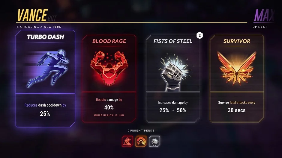 The maps are not going to change how you play the game at its core, but they do have hazards, drops and moving walls that add a lot of flavor to each match. The maps vary from night time city rooftops to gritty assembly lines and even a nice resort. The are very good looking actually, but never distracting, more function than flash The last and most unique part of the gameplay is the perk system. At the end of each round, a number of perks appear depending on the number of people playing, for example; three people gives three perks to choose from. The person who did the worst picks the first perk and so on until the person winning gets the one leftover perk. This allows for a fun catch up mechanic which doesn’t give last place a chance to easily win, but allows them to play more towards their preferred style and stack perks for themselves to be much quicker or do a sizable amount of damage compared to others. The perks are surprisingly diverse, faster cool down on dodge, freezing enemies, draining life, more attack or defense to name a few. By the end of any match, there will be a slow creep of chaos that is manageable and feels very fair and fun.