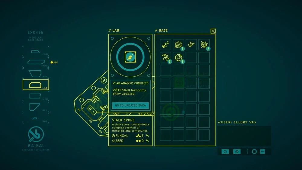 The two-dimensional map and gameplay design create a simplistic set of controls. As the AI guides Ellery Vas across the ocean floor, everything can be achieved with an intuitive interface. Movement, specimen sampling, underwater maneuvers, and scientific analysis can all achieved with minimum input from the player.