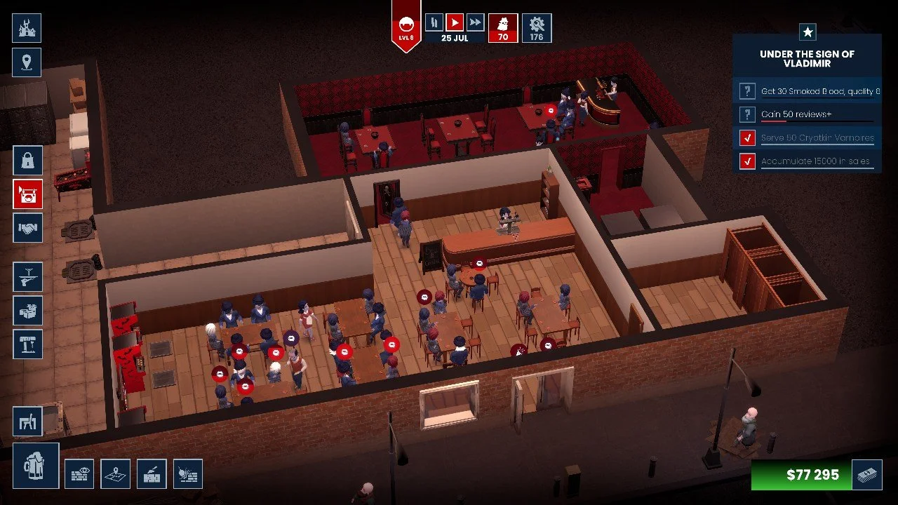 While Blood Bar Tycoon does a great job offering two distinct playstyles, I found myself wishing for something in between cozy and bloody mode. Sometimes, I don’t want the full pressure of managing every financial detail, but I also don’t want a purely creative, stress-free experience.