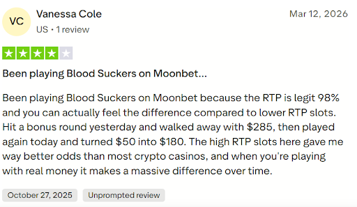 We found Moonbet to be a great Jackbit alternative. True no-KYC under $2,000, genuine 20% rakeback from day one, and verified 4-5 minute withdrawals represent measurable improvements. With a 4.1 Trustpilot rating versus Jackbit's 1.7, early user feedback supports these claims. Testing confirms core promises and transparent calculations that Jackbit cannot match. Players who previously used Stake can also see why Moonbet is a smarter choice for banned US players.