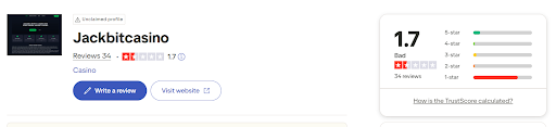 Jackbit's Trustpilot profile shows a 1.7/5 rating based on 34 reviews, with a heavy concentration of 1-star feedback. Recent complaints show a troubling picture.
