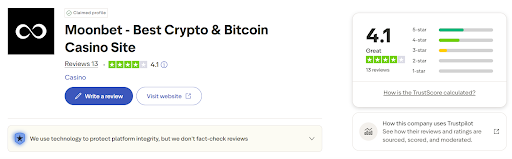 Trustpilot shows Moonbet with a 4.1/5 rating based on 13 reviews, significantly higher than Jackbit's 1.7/5 rating. The "Great" designation reflects positive early user feedback, with most reviews highlighting fast withdrawals and transparent operations.