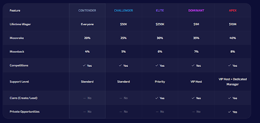 The VIP structure uses 5 tiers versus Jackbit's 11. Contender starts with 20% Moonrake + 5% Moonback. Apex reaches 40% Moonrake + 8% Moonback. Dedicated VIP managers become available at the Elite tier ($250,000 lifetime wagers).