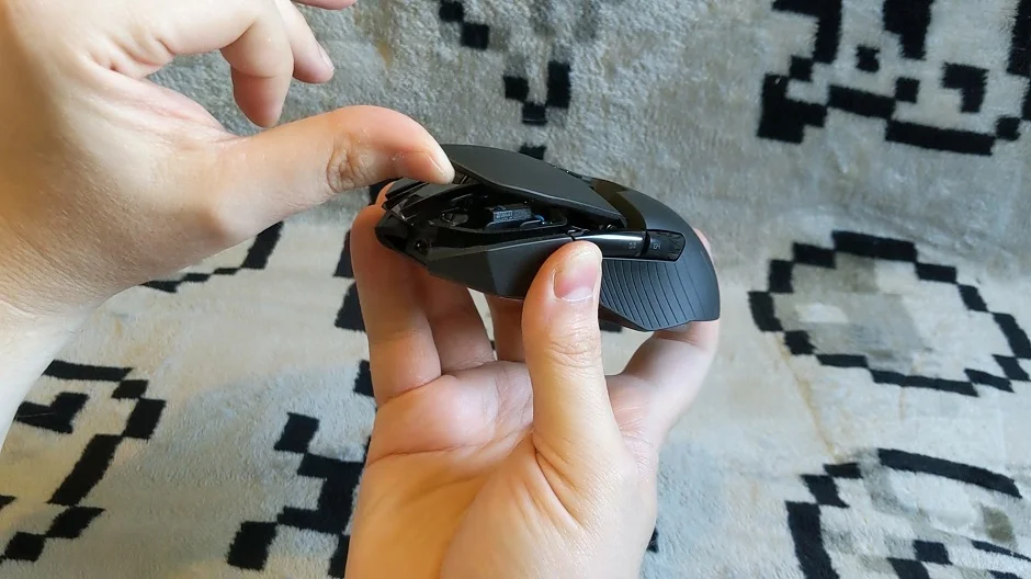 The underside of the G903 Hero has a glossy angled outline that contains the power switch, more Logitech G branding, and a profile selection button. Profiles can be edited and stored to the mouse by using the Logitech G HUB software. 6 Glide pads are employed to help reduce friction on the mouse to make moving it around easier. The 2 innermost glide pads have the added benefit of helping keep the Hero sensor a bit cleaner. There is also a circular compartment that can be fitted with the 10g weight found in the accessories box. This slot is also used for the PowerPlay wireless charging pad and can’t be used for weight and charging at the same time sadly.