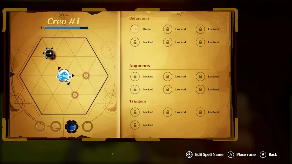 Combining spells is where most of the fun of the game came from for me. Each spell is set on a grid system with certain paths that can be used to add augmentations. Each augmentation then adds its own paths that further augmentations can be placed. Depending on how you place things factors in to the end result of the spell. Place (move) on Actus followed by (right) attached to (move) results in a fireball that arcs in a rightward circle. Place (move) on Actus and (right) on Actus produces a fireball that shoots straight right away from Zia. there are numerous combinations to explore and after learning a few the game thankfully lets you save your favorites to individual spells. Thankfully all the spell combinations you make can be quickly selected without having to navigate any menus. A simple press of the L button plus the button used for the spell you wish to change cycles through each of your saved combinations.