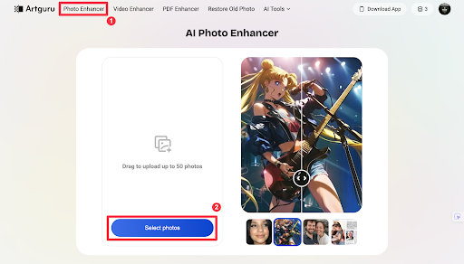 If you want a simple and time-saving tool, Artguru is a practical option. It’s designed to handle photo enhancement and upscaling in a surprisingly easy flow: upload your screenshot, select enhancement, let the AI process, and download your ready-to-share screenshots.