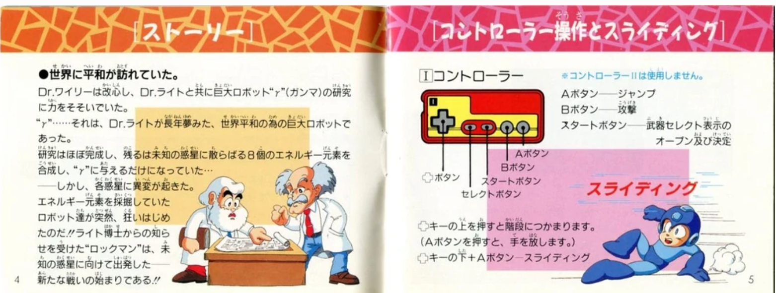 Mega Man 3's story had Dr. Wily and Dr. Light make a truce to build a gigantic "peacekeeping" robot called "Gamma". Together, they make Robot Masters mine crystals or something. To this day, I have no idea how mining crystal or how building a giant robot is meant to "keep the peace". Of course, the Robot Masters go berserk, Mega Man is forced to reign them in with the help of his new canine companion Rush (named after the band!), and along the way Mega Man is confronted and helped by the mysterious Break Man. The only way to get the full skinny is to read the manual: the game is devoid of an opening cutscene and has very little text in general.