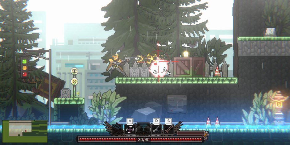 Starting off in the training zone, you can get the hang of using the movement controls, including double-jumping and dashing, and the melee combat aspects. Shortly on you will be given your first gun, which you have to equip from your inventory menu, and this will start giving you ranged attacks. This gun aspect will be pretty essential to the game because, even though it does less damage than your melee attacks, it provides a way to work through the light puzzle elements of the game.