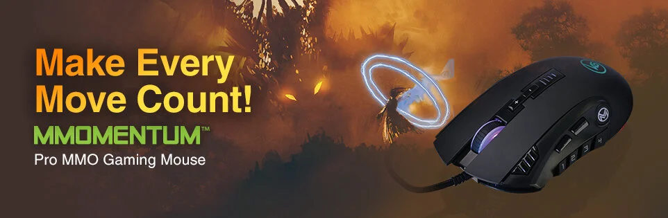The MMOMENTUM Pro MMO Gaming Mouse has a lot going for it. It’s sleek. The flared edges and ergonomic design offer both style and comfort. And the programmable buttons make gaming that much easier with shortcuts within quick and easy reach of your fingers.
