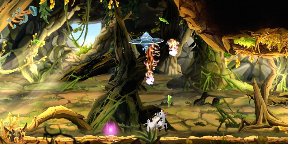 Cows are your main objective as you need to abduct them in order to send them back to your home planet where they could harvest the milk out of them to power their world. So, obviously, this must be the fight sequence and battling cows are sure to become harder the further we go along. However, the first fight was a lot harder than I had expected, but at least they gave us a “milk geyser” to recharge our attacks and a “health pod” to collect more health during this fight. It was very helpful during this fight as the unexpected challenge when facing off with the cow was something I simply wasn’t ready for!