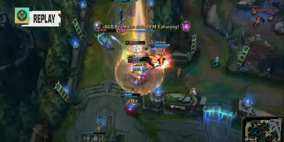 After SGB lost their lead around 20 minutes due to losing some team fights, they started to get pressured hard by DFM and it was looking like DFM might win, but then SGB’s jungler BeanJ popped off! In a team fight near SGB’s base, their jungler BeanJ saved a team fight, and the entire game with an amazing Dianna ultimate that damaged and cc’d 3 of DFM’s players long enough for SGB’s two AD carries to shred DFM’s team without getting targeted themselves!