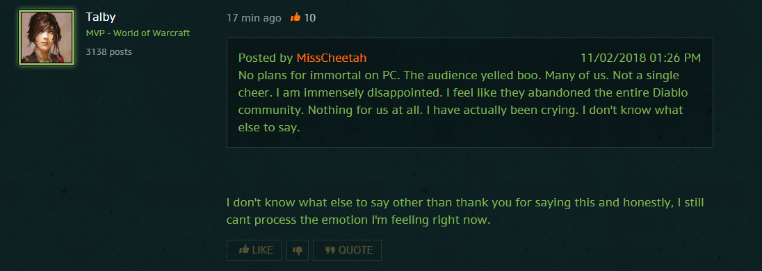 Seems odd for a series that started a PC Action RPG revolution right? Not to mention, we already have a Switch version that launched today for those who want a mobile experience. Do we really need a watered down version of Diablo III on the go on mobile devices? Apparently, I am not the only one who feels this way as Blizzards own MVPs are outraged on the official forums. Trailers are being down voted. Forums are flooded with ‘Press F to pay respects’ to a dead series threads. Also, the panel got booed when they confirmed it was exclusive to mobile devices. Either way, the whole reveal and following Q&A where a fan actually asked “Is this an out of season April Fools Joke?” was awkward to say the least and left many confused and wanting.