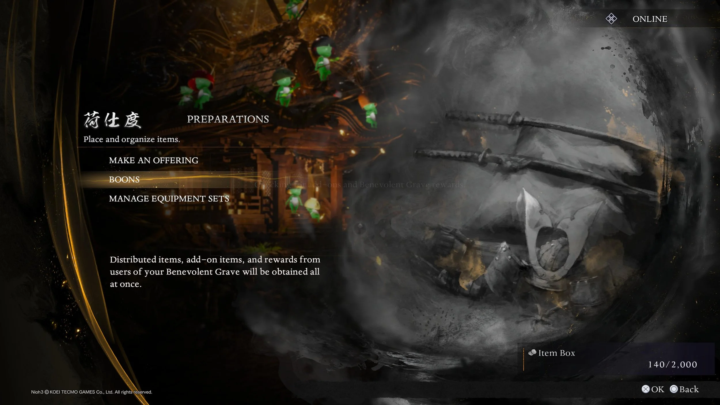 To claim the bonus items you’ve obtained with one of your Nioh 3 purchases, you’ll need to head to any shrine in the game. Once you’re there, simply select Preparations > Boons to have the game automatically check for any items. If any are available, you’ll receive them here.